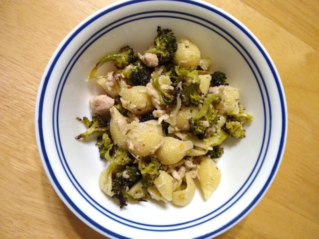 Roasted broccoli and garlic cloves, shell pasta, oil-packed tuna, Parmigiano Reggiano, red wine vinegar, capers, red pepper flakes, and dried herbs.